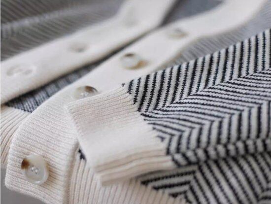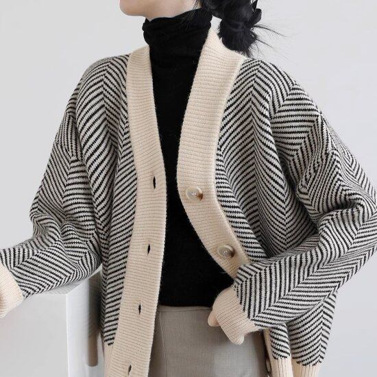 レトロシックなヘリンボーン柄のニットカーディガン。