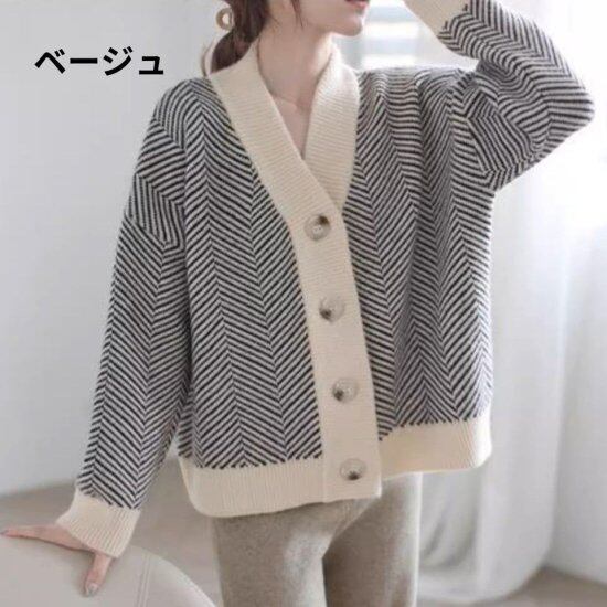 ニットカーディガン レディース Vネック ヘリンボーン 長袖 ゆったり オーバーサイズ レトロ クラシカル シック モードきれいめ 上品 エレガント カジュアル オフィス おでかけ おしゃれ