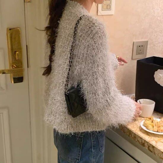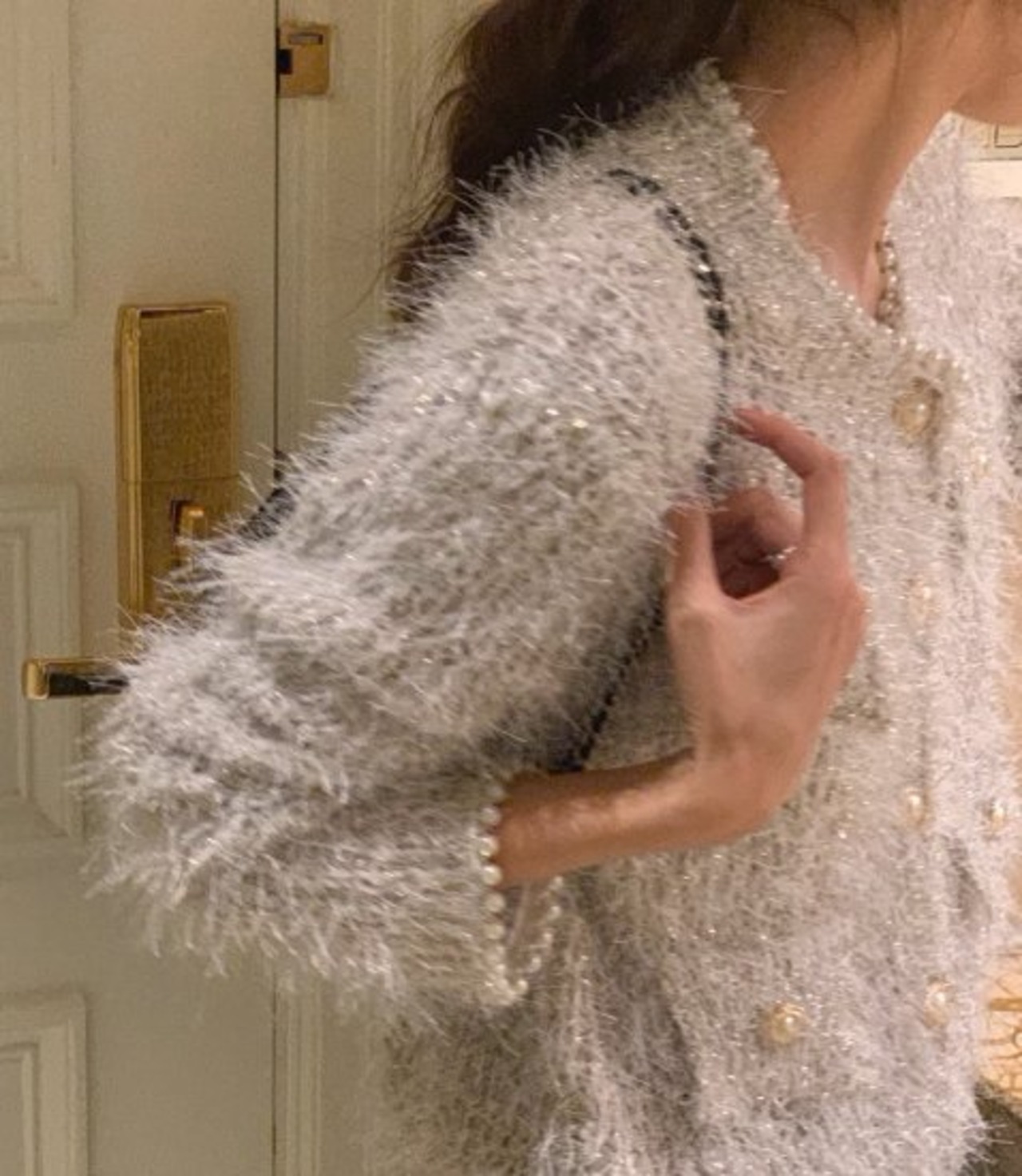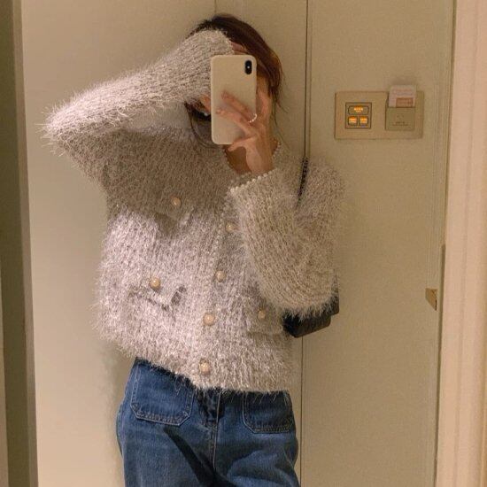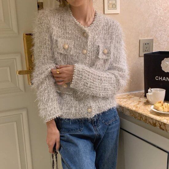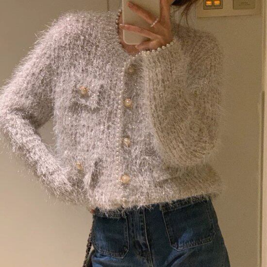 パールがあしらわれたふわふわニットカーディガン。