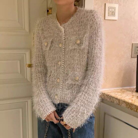 ニットカーディガン レディース ニットジャケット セーター 長袖 パール ノーカラー ラウンドネック ショート丈 ふわふわ レトロ クラシカル きれいめ エレガント オフィス パーティー おしゃれ