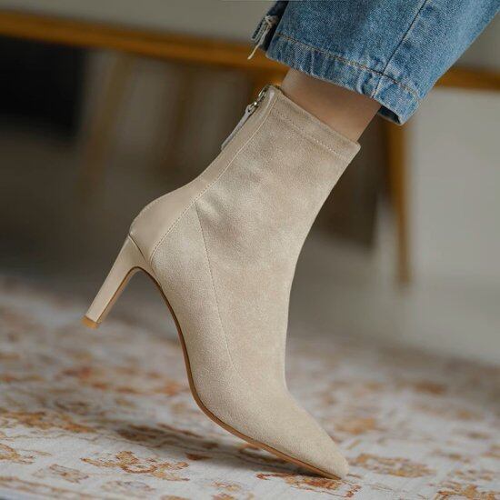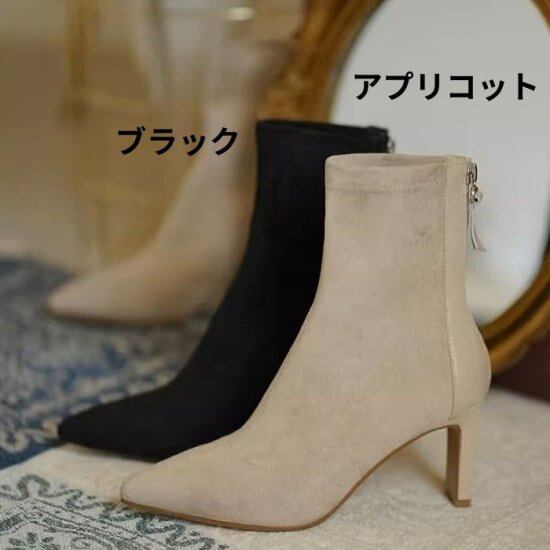 ショートブーツ レディース スエードブーツ ポインテッドトゥ ハイヒール 7.5cmヒール アンクルブーツ スリム バックファスナー 異素材ミックス きれいめ エレガント カジュアル おしゃれ