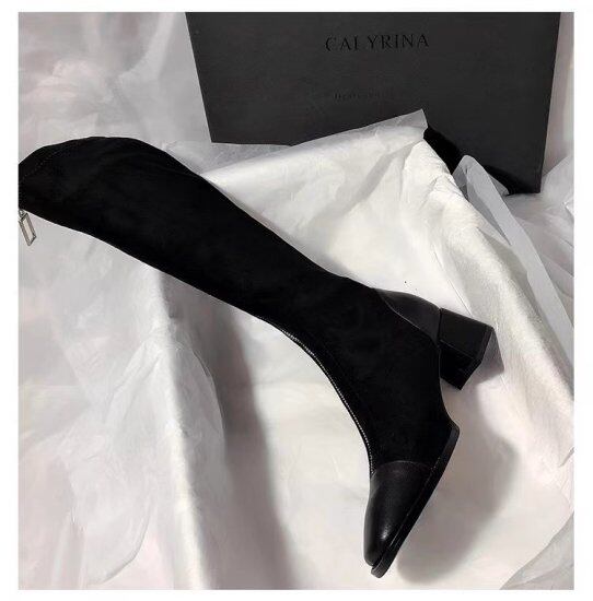 ロングブーツ レディース センタージップ スクエアトゥ 切り替え 異素材ミックス 太ヒール ミドルヒール 4.5cmヒール フロントファスナー ロング丈 きれいめ エレガント カジュアル おしゃれ