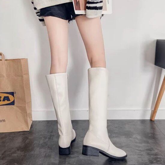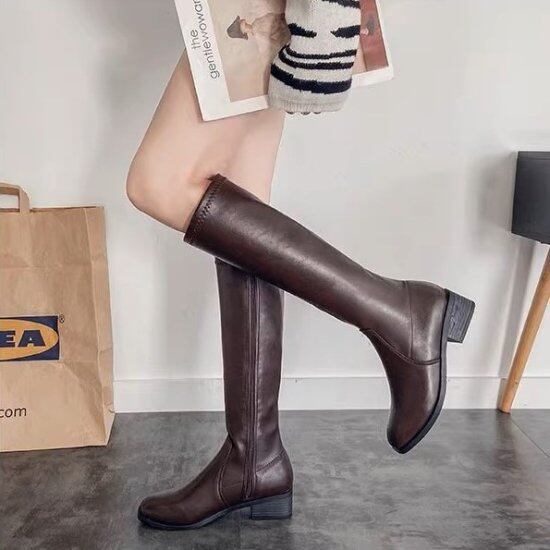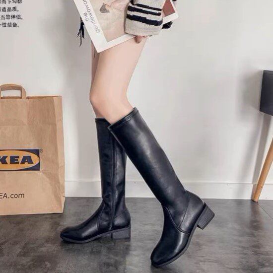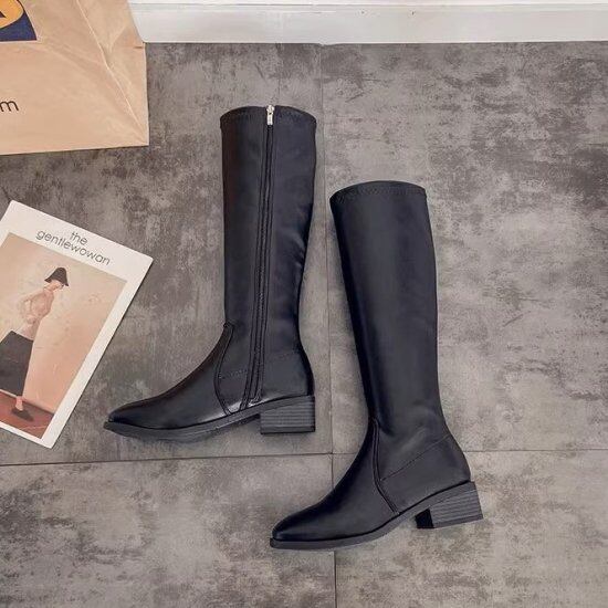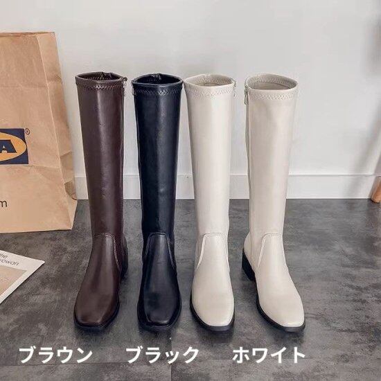 ロングブーツ レディース スクエアトゥ フェイクレザー ロング丈 太ヒール ミドルヒール ローヒール 4cmヒール サイドファスナー シンプル きれいめ カジュアル 歩きやすい オフィス おしゃれ