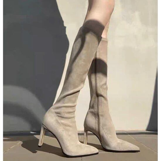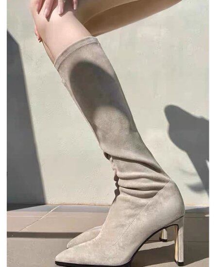 ロングブーツ レディース スエードブーツ ポインテッドトゥ フェイクレザー エコレザー ロング丈 ハイヒール 8.5cmヒール ストレッチ サイドファスナー きれいめ セクシー カジュアル おしゃれ
