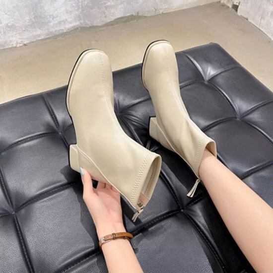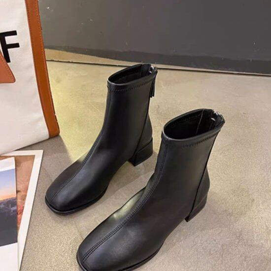 ショートブーツ レディース アンクルブーツ ストレッチ スクエアトゥ フェイクレザー エコレザー 太ヒール チャンキーヒール 4cmヒール バックファスナー きれいめ カジュアル おしゃれ