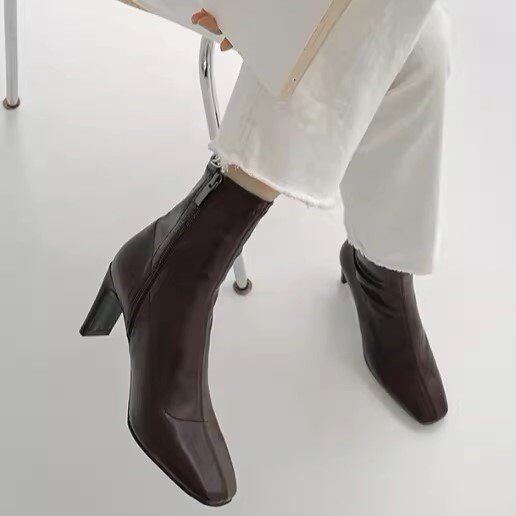 ショートブーツ レディース スエードブーツ スクエアトゥ フェイクレザー エコレザー ストレッチ サイドファスナー ハイヒール 7cmヒール レトロ クラシカル きれいめ カジュアル おしゃれ