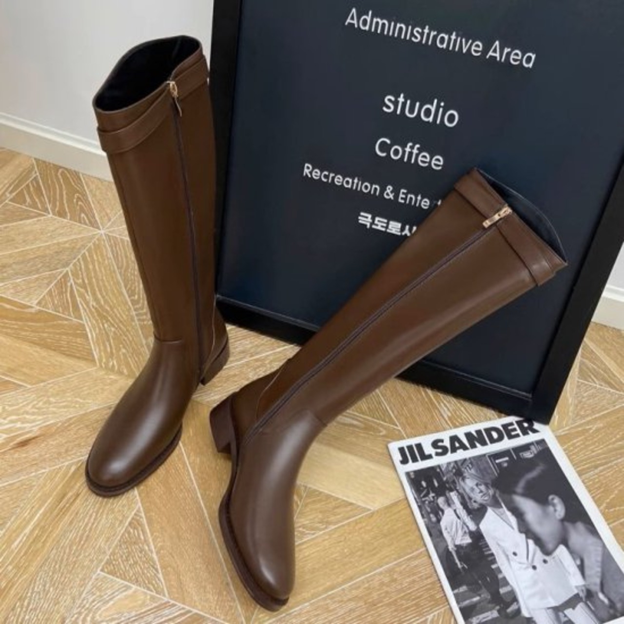 ロングブーツ レディース ベルト ジョッキーブーツ ラウンドトゥ 太ヒール ローヒール 3.5cmヒール 2color シンプル レトロ クラシカル サイドファスナー きれいめ カジュアル おしゃれ