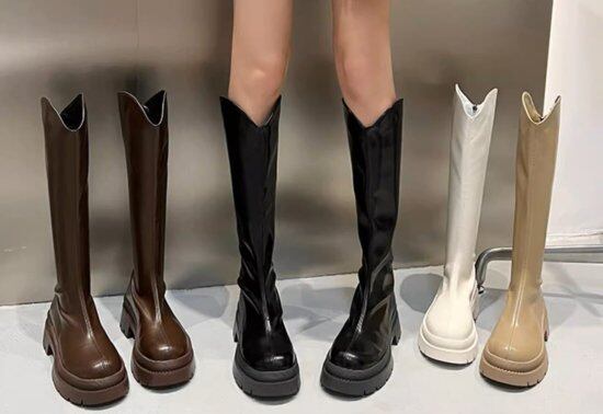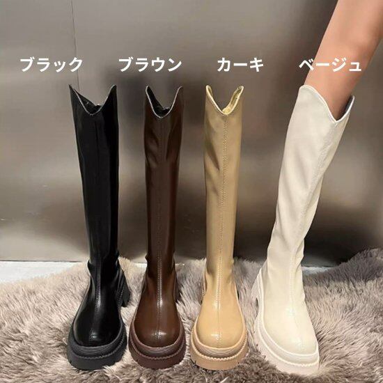 ロングブーツ レディース 厚底ブーツ Vカット ボリューム フェイクレザー エコレザー バックファスナー プラットフォーム ミドルヒール 5.5cmヒール 4color カジュアル 脚長 おしゃれ