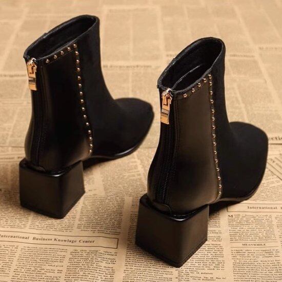 ショートブーツ レディース スエードブーツ 異素材ミックス スタッズ スクエアトゥ アンクル 太ヒール チャンキーヒール ハイヒール 6cmヒール バックファスナー きれいめ カジュアル おしゃれ