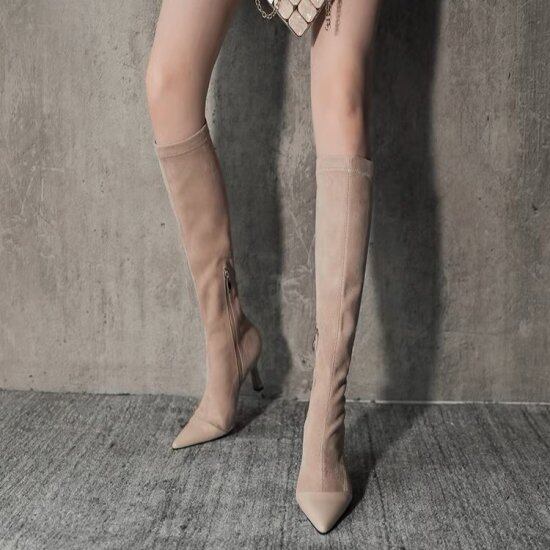 ロングブーツ レディース スエードブーツ ポインテッドトゥ スリム タイト 細ヒール ハイヒール 8cmヒール 切り替え きれいめ エレガント セクシー カジュアル ロング 脚長 美脚 おしゃれ