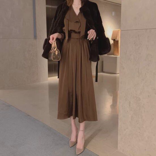 ワンピース レディース ボウタイワンピース Vネック リボン 長袖 ギャザースカート ロングワンピース ミディアム丈 ミモレ丈 光沢 きれいめ 上品 エレガント シック オフィス おでかけ おしゃれ