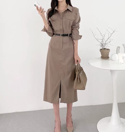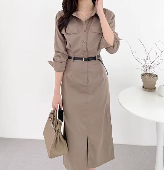 シャツワンピース レディース ワンピース ミドル丈ワンピース 長袖ワンピース ポロ襟 襟あり プルオーバー カジュアル お出かけ おしゃれ きれいめ ボタン ハイウエスト スリット 女性 ファッション
