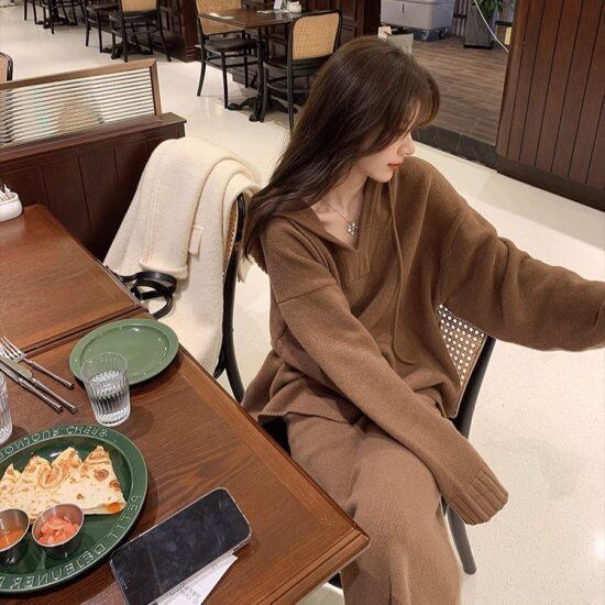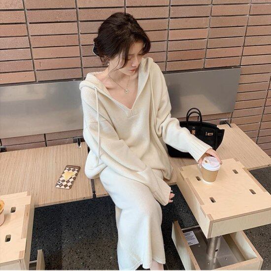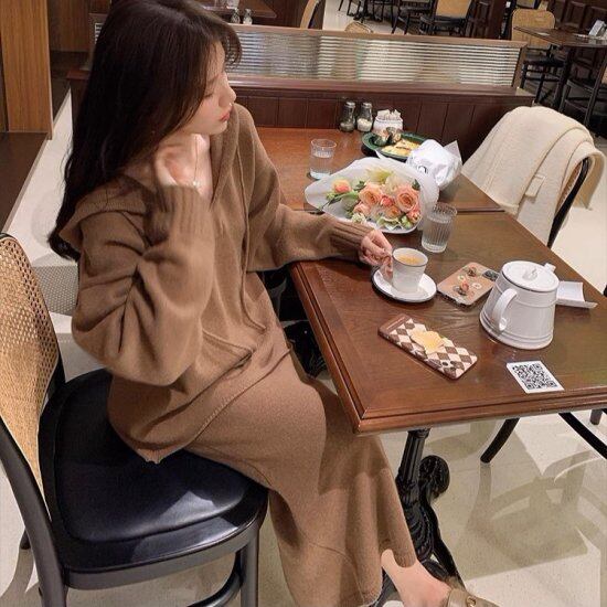 リラクシーなニットパーカーとタイトスカートのセットアップ。