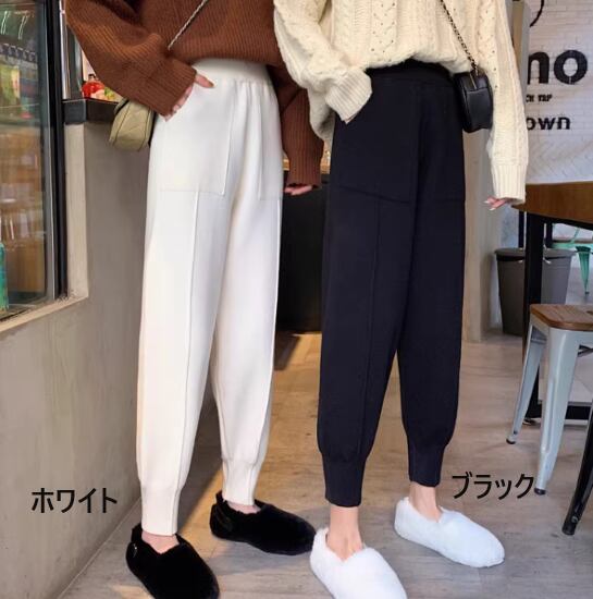 ロングパンツ レディース ボトムス パンツ 長ズボン ハイウエスト センターライン ポケット シンプル 無地 カジュアル お出かけ おしゃれ リラックス ルームウェア ニットパンツ ハーレムパンツ