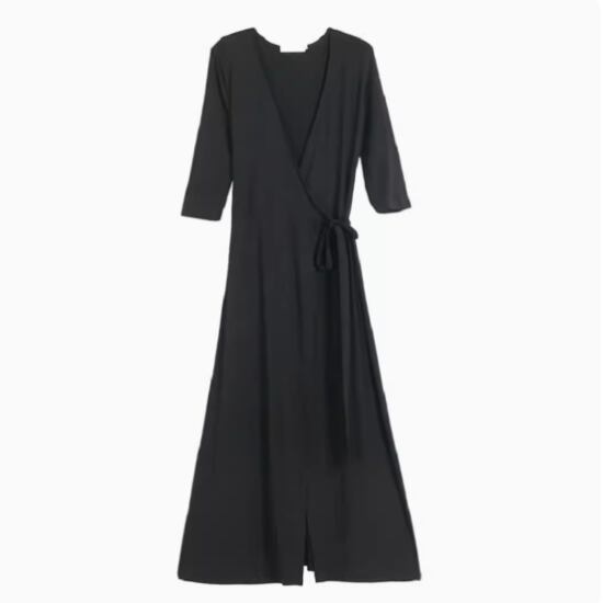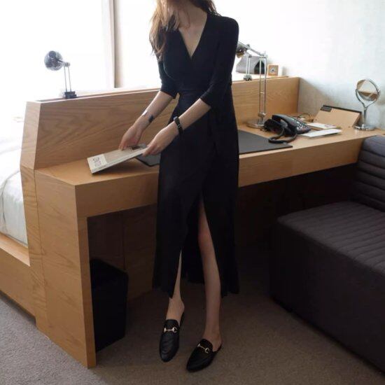ロングワンピース レディース カシュクールワンピース Vネック 五分袖 七分袖 スリット フレアワンピース Aライン 薄手 黒 ブラック ミモレ丈 きれいめ エレガント セクシー おでかけ おしゃれ