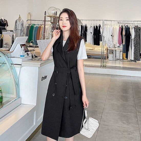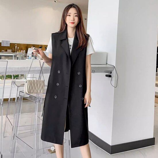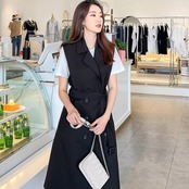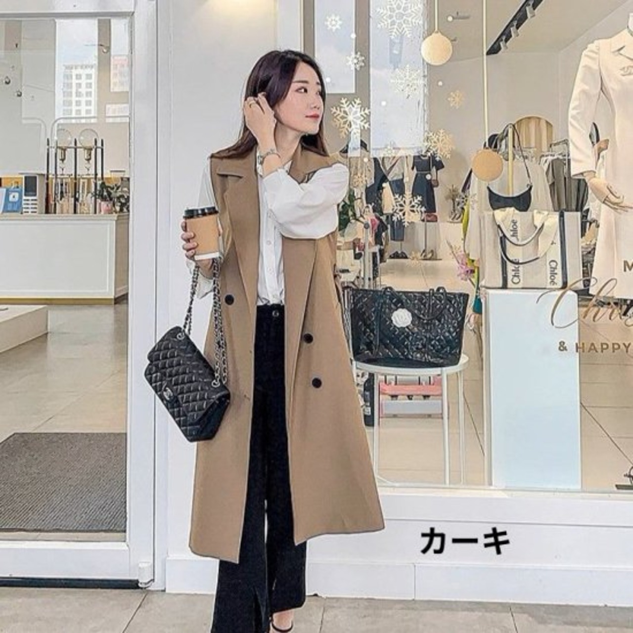 ロングジレ レディース ベスト ロング丈 ノースリーブ テーラードカラー ダブルブレスト トレンチ風 ベルト Vネック ワンピース きれいめ マニッシュ メンズライク おでかけ オフィス おしゃれ