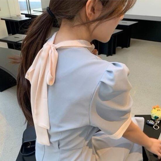 ワンピース レディース 半袖ワンピース バイカラーワンピース ハイネック スタンドカラー スカーフ風 バックリボン パフスリーブ ミモレ丈 ロング丈 スリム きれいめ 上品 オフィス おしゃれ