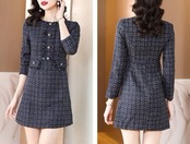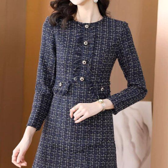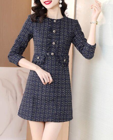 ワンピース レディース ツイードワンピース 長袖 Aライン ミニ丈 ミディアム丈 ラウンドネック チェック 九分袖 フリンジ レトロ クラシカル きれいめ エレガント おでかけ お呼ばれ おしゃれ