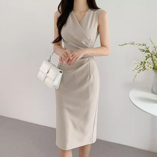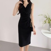 ワンピース レディース ノースリーブワンピース Vネック ドレープ カシュクール タイトワンピース ひざ丈 ミディアム丈 ミモレ丈 きれいめ エレガント ドレス パーティー フォーマル おしゃれ