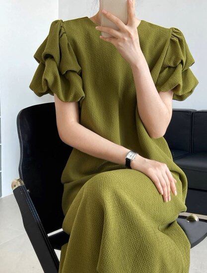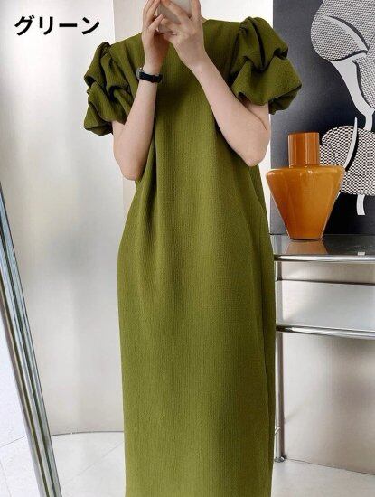 ロングワンピース レディース 半袖ワンピース ボリューム袖 パフスリーブ ロング丈 マキシ丈 ラウンドネック レトロ クラシカル ゆったり 体型カバー かわいい きれいめ エレガント おしゃれ