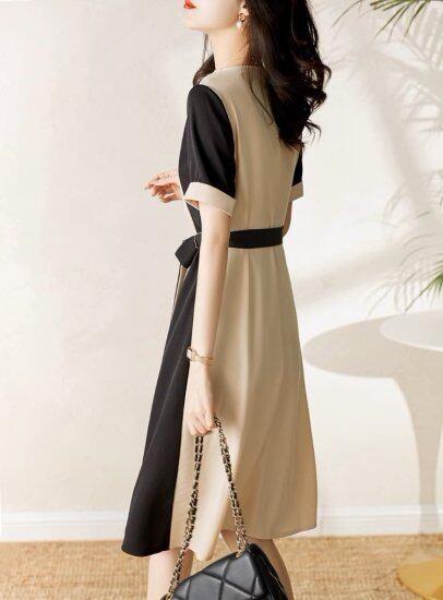 ワンピース レディース 半袖ワンピース バイカラー 配色ワンピース Vネック ウエストリボン ひざ丈 ミモレ丈 個性的 ユニーク Aライン きれいめ 上品 おでかけ お呼ばれ オフィス おしゃれ