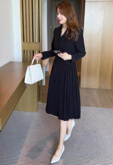 ワンピース レディース サイドプリーツワンピース Vネック トレンチ風 ダブルブレスト ひざ丈 ミモレ丈 ロング丈 プリーツ 2color きれいめ 上品 オフィス おでかけ お呼ばれ おしゃれ