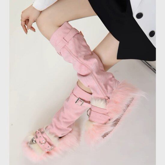 ロングブーツ レディース ファーサンダル 個性的 ユニーク フェイクレザー フェイクファー ミドルヒール 5cmヒール フラット 2way ベルト スリッパ カジュアル ストリート おしゃれ