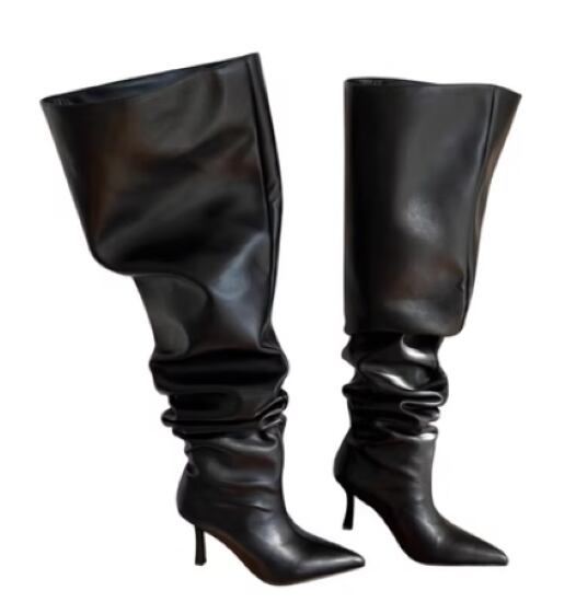 ロングブーツ レディース ブーツ 靴 シューズ ワイドブーツ ルーズ ゆったり ハイヒール ピンヒール ボリューム 美脚 脚長 ポインテッドトゥ 個性的 カジュアル お出かけ おしゃれ きれいめ 黒