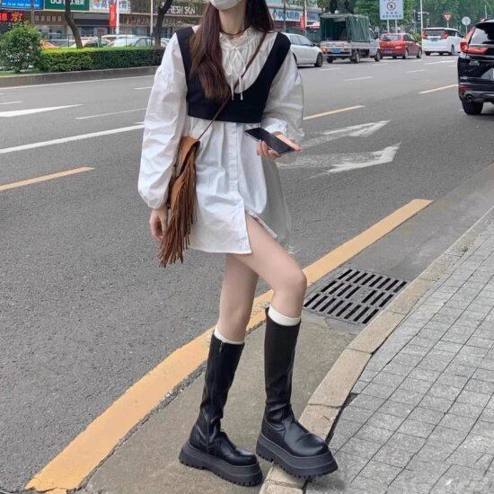 ボリュームのある厚底タイプが美脚効果を演出するロングブーツ。