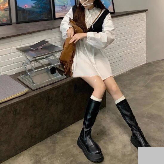 ロングブーツ レディース 厚底ブーツ ラウンドトゥ ボリュームソール フェイクレザー エコレザー サイドファスナー フラット 6cmヒール カジュアル 脚長 美脚 ストリート ロング 黒 おしゃれ