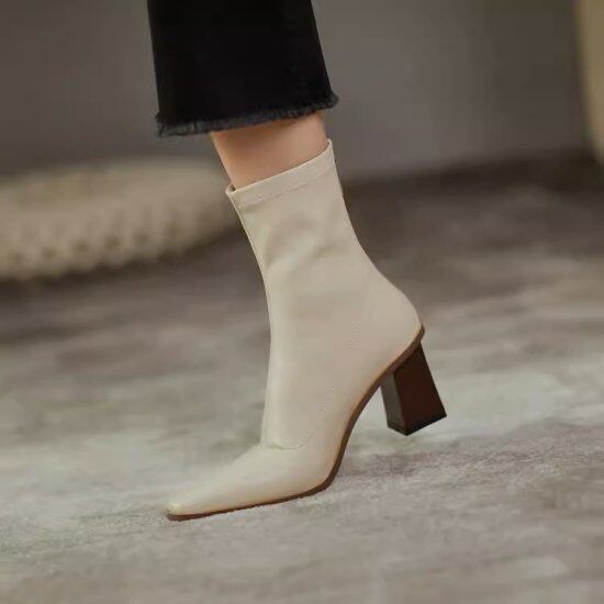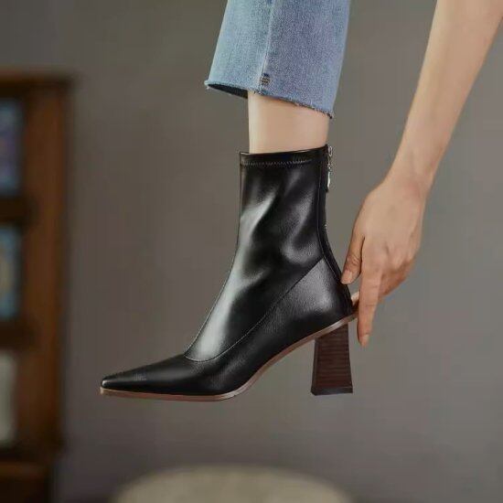 ショートブーツ レディース ポインテッドトゥ スクエアトゥ フェイクレザー バックファスナー 太ヒール チャンキーヒール 7cmヒール きれいめ エレガント カジュアル 2color おしゃれ