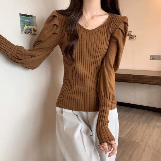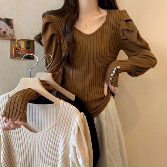 ニット レディース Vネック プルオーバー 長袖 切り替えニット セーター 異素材ミックス リブニット パフスリーブ ボリューム袖 ボタン スリム タイト きれいめ エレガント オフィス おしゃれ