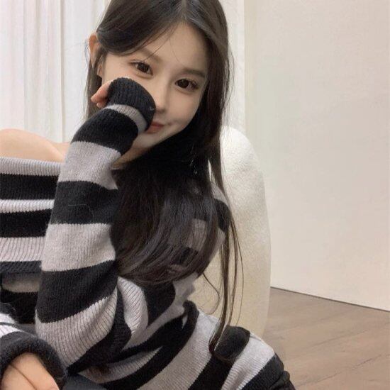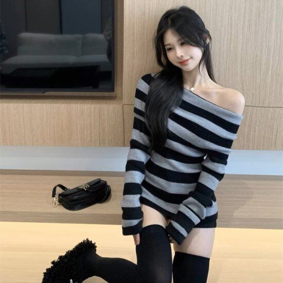 ニットセーター レディース オフショルダー ボーダー 長袖 スリム タイト リブニット ボートネック 伸縮性 レトロ ボーダーニット 個性的 2color かわいい カジュアル おでかけ おしゃれ