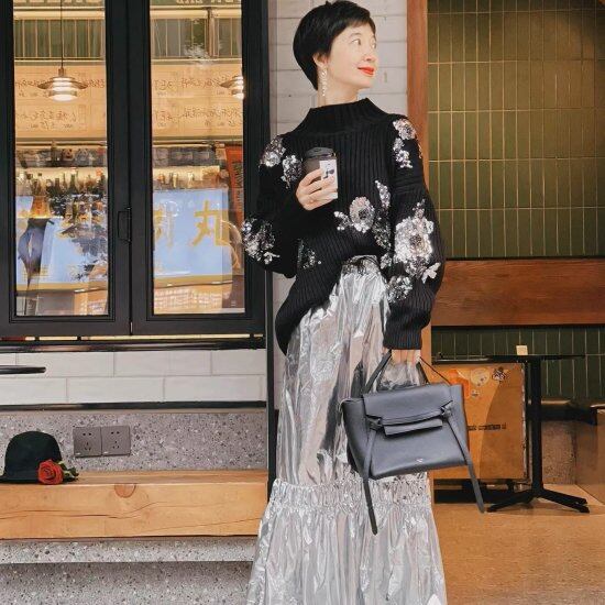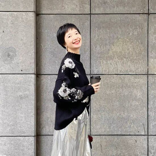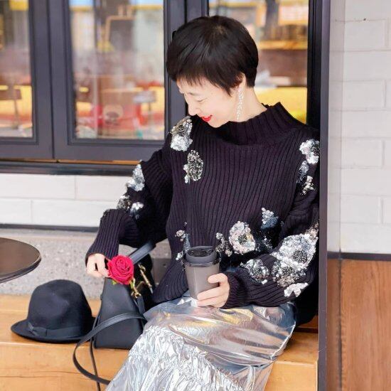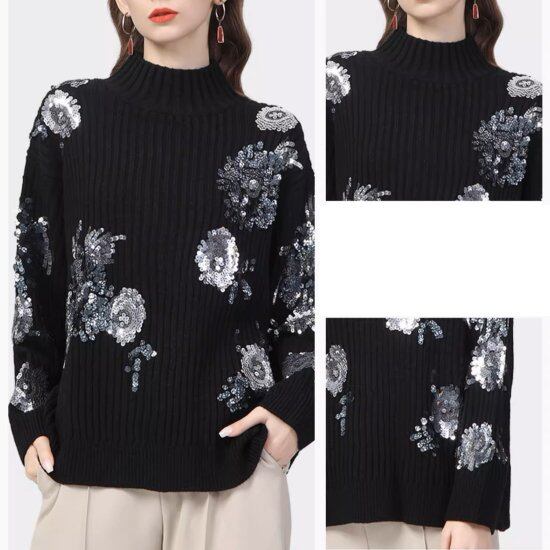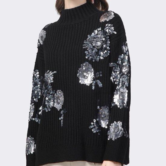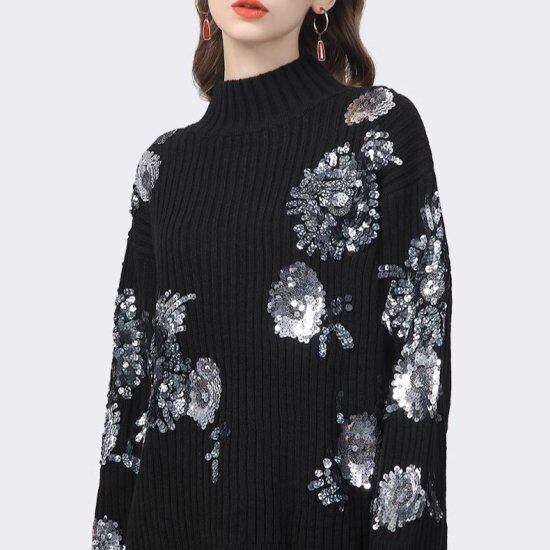 ニットセーター レディース スパンコール 花柄 ハイネックニット 長袖 ボトルネック プルオーバー リブ ゆったり オーバーサイズ レトロ きれいめ エレガント 個性的 フラワーモチーフ おしゃれ