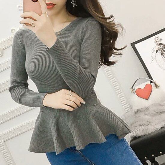ニットセーター レディース ペプラム ラウンドネック 長袖 フリル スリム タイト 裾フリル リブニット 薄手 ストレッチ かわいい きれいめ ガーリー 4color おでかけ オフィス おしゃれ