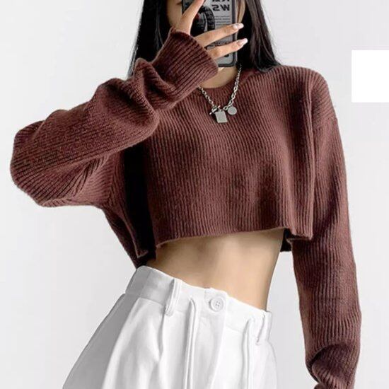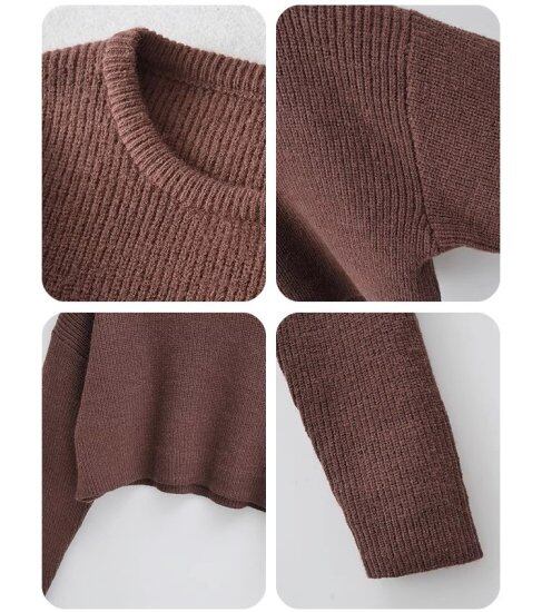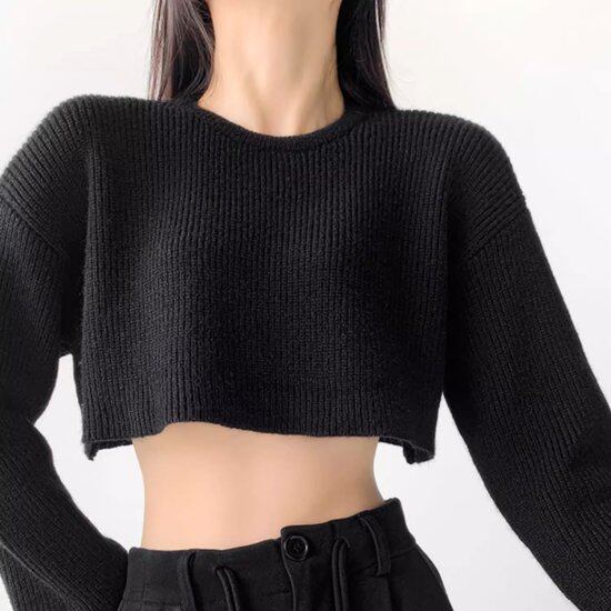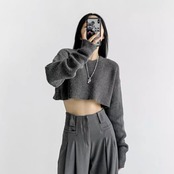 ニットセーター レディース クロップドニット 長袖 ショート丈 ラウンドネック プルオーバー 肌見せ ルーズ レイヤード かわいい ガーリー カジュアル ストリート モード 4color おしゃれ