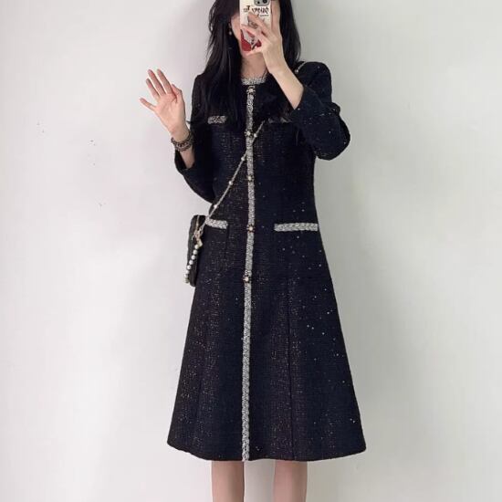 ツイードワンピース レディース ワンピース Aラインワンピース 膝丈ワンピース 長袖 ラウンドネック ビーズ装飾 きらきら きれいめ エレガント お呼ばれ フォーマル お出かけ おしゃれ ボタン