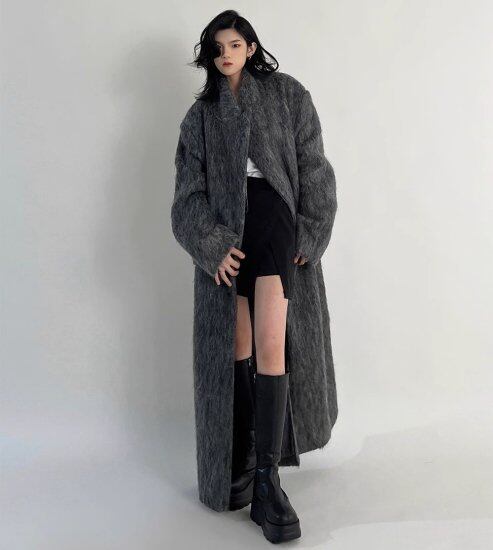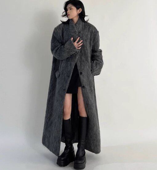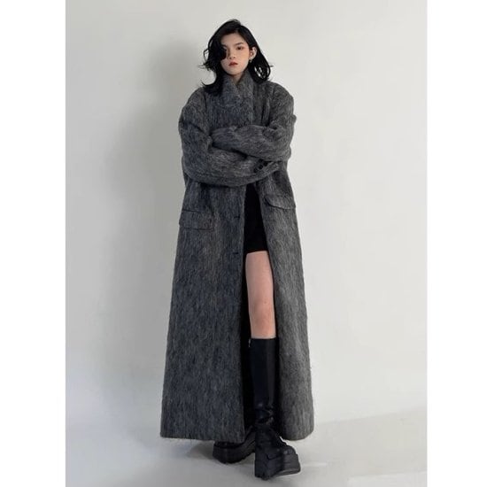 ロングコート レディース チェスターコート グレー ロング丈 マキシ丈 テーラードカラー シングルブレスト シャギー レトロ オーバーサイズ メンズライク ユニセックス マニッシュ おしゃれ