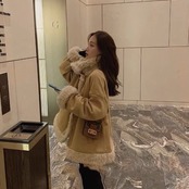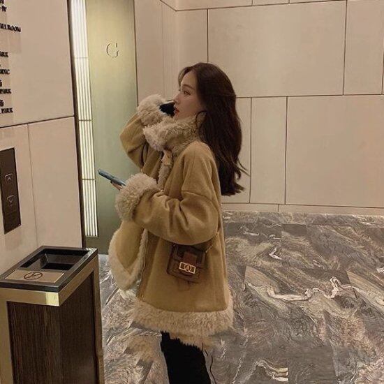 ボリュームのあるボアがかわいいミディアム丈コート。