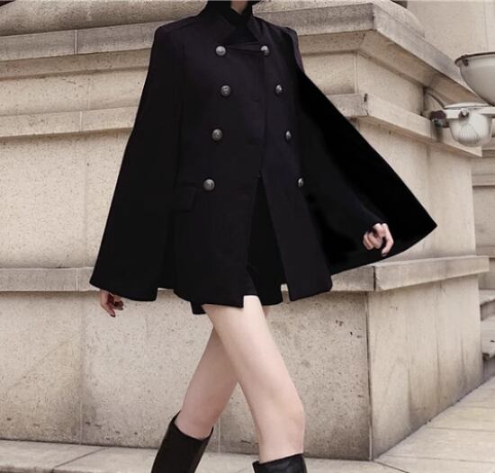 ケープコート レディース アウター 羽織 ショート丈コート ポンチョ マント 黒 ブラック ダブルブレスト ボタン スタントカラー きれいめ スタイリッシュ エレガント カジュアル お出かけ おしゃれ