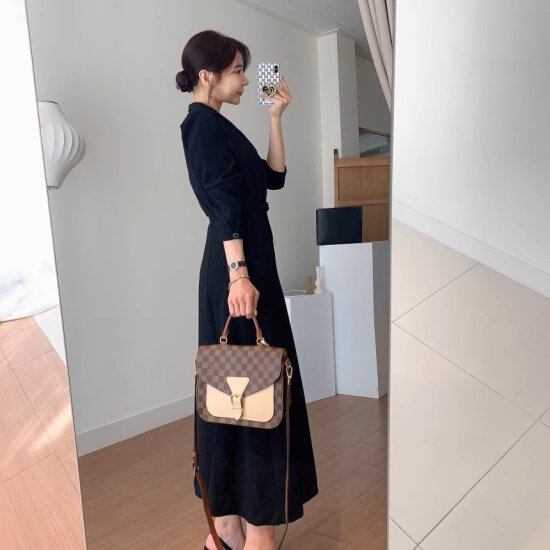 ボタン使いとショールカラーがエレガントなロングワンピース。
