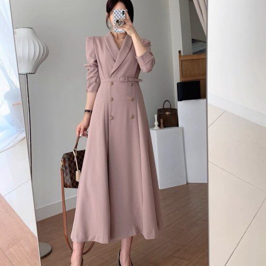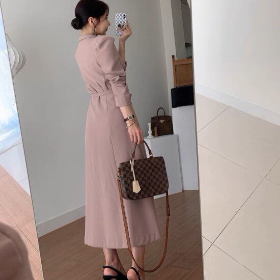 ロングワンピース レディース Vネック ショールカラー 長袖 ベルト ダブルブレスト ミモレ丈 ロング丈 無地 レトロ クラシカル きれいめ エレガント おでかけ オフィス 3color おしゃれ