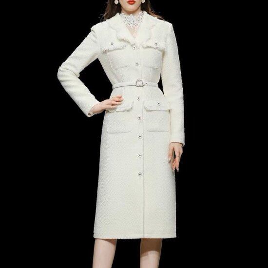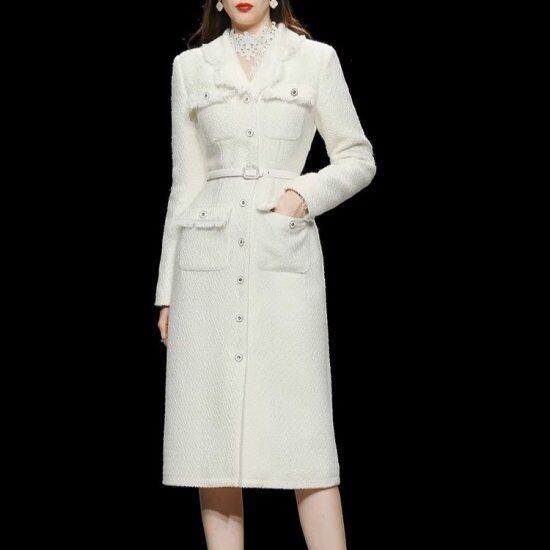 ワンピース レディース ドレスコート ツイード Vネック 長袖 テーラードカラー スーツ襟 ボタン フリンジ ベルト レトロ クラシカル きれいめ エレガント 上品 おでかけ パーティー おしゃれ