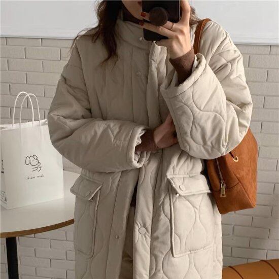 ロングコート レディース キルティングコート 中綿コート スタンドカラー ポケット ミモレ丈 ロング丈 ノーカラーコート レトロ かわいい カジュアル 2color おでかけ オフィス おしゃれ