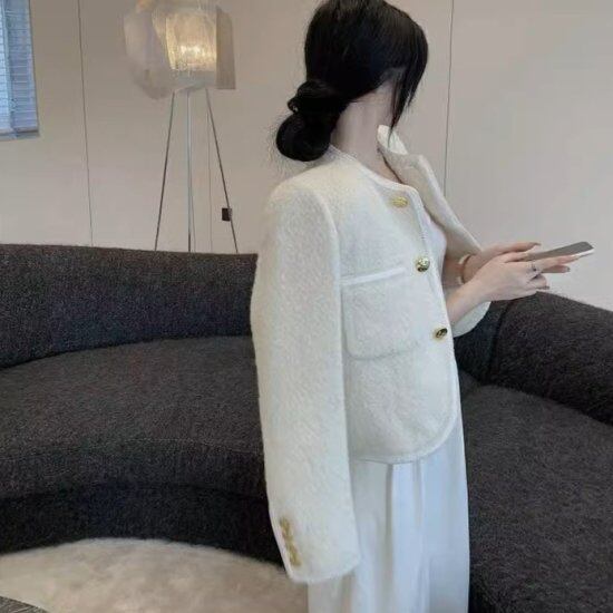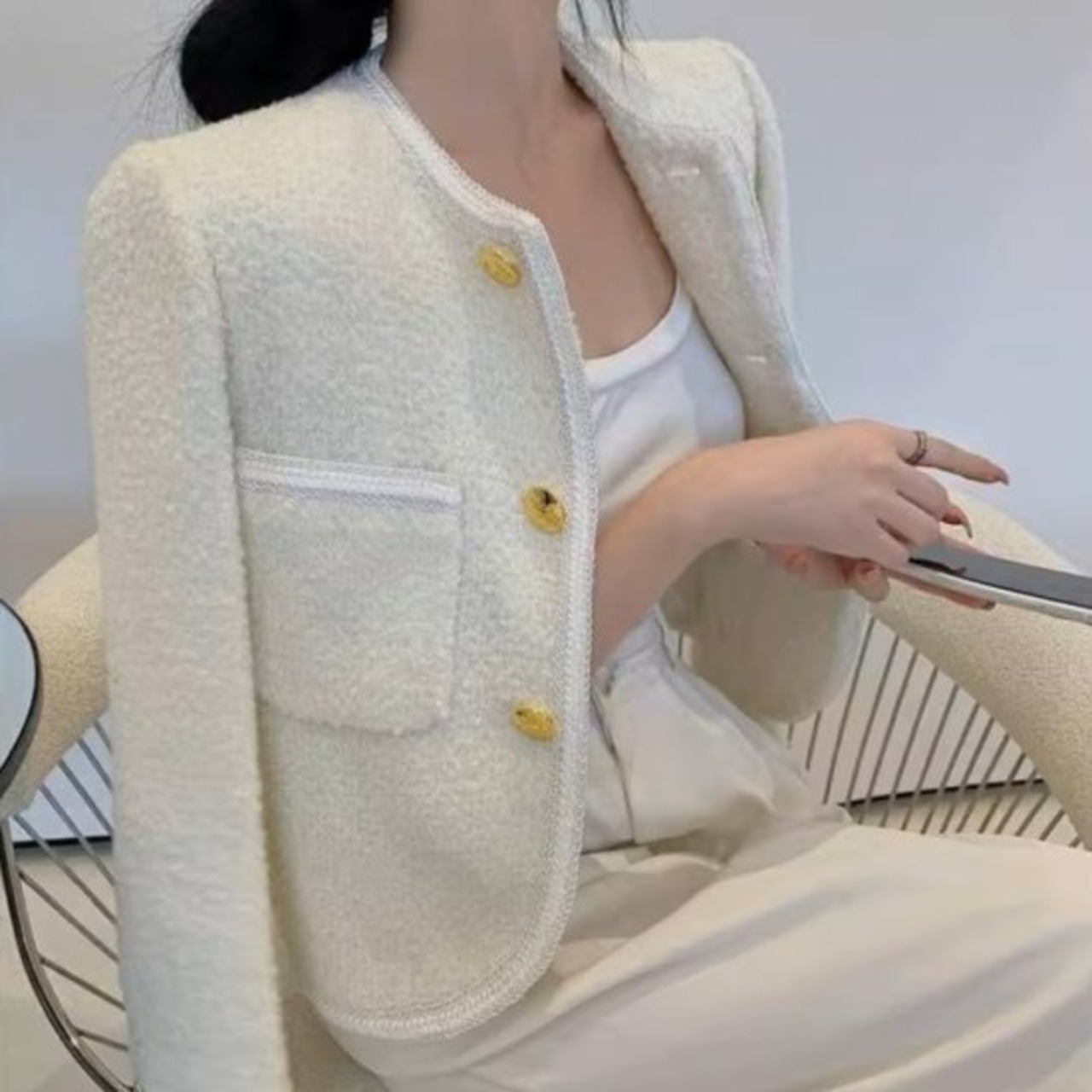 ノーカラージャケット レディース ショートジャケット ラウンドネック 長袖 シングルブレスト ポケット レトロ クラシカル きれいめ 上品 カジュアル オフィス オケージョン 2color おしゃれ