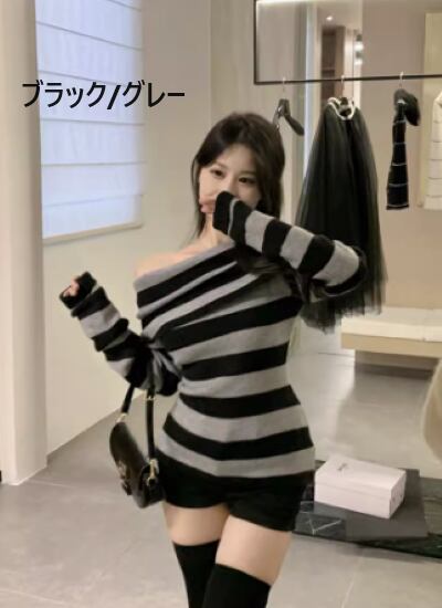 ニットセーター レディース トップス ニット セーター オフショルダー 肩出し 長袖 ボーダー バイカラー セクシー スリムフィット カジュアル お出かけ おしゃれ 肌見せ 秋冬 ファッション 女性