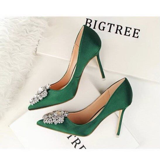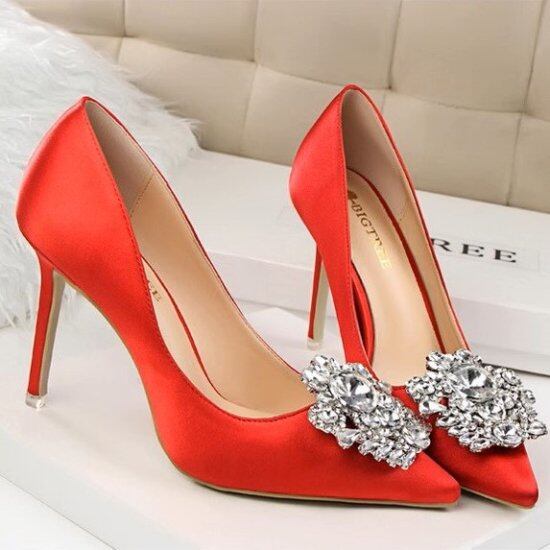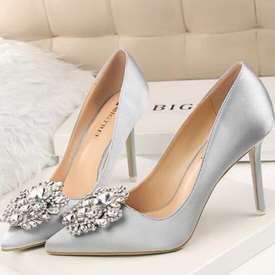 大きめビジューが華やかなハイヒールパンプス。