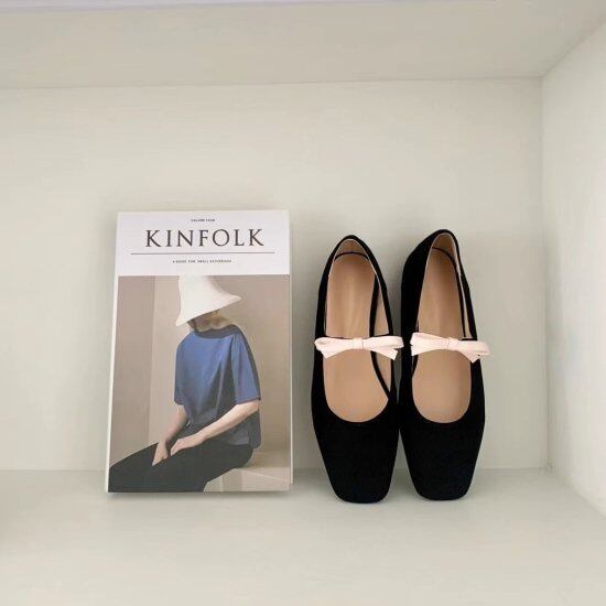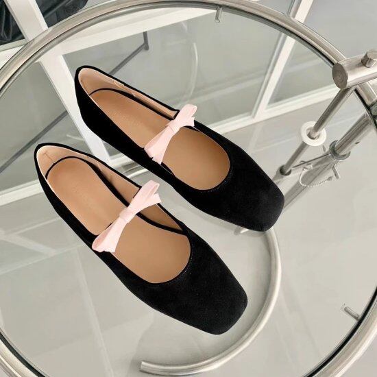 リボンフラットシューズ レディース バレエシューズ スエード スクエアトゥ ローヒール パンプス リボンストラップ かわいい ガーリー フェミニン レトロ クラシカル おでかけ お呼ばれ おしゃれ