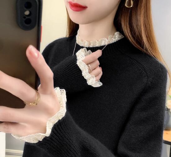ニットセーター レディース トップス ニット セーター プルオーバー スタンドカラー レース フリル ガーリー 可愛い フェミニン 長袖 シンプル 無地 カジュアル お出かけ おしゃれ きれいめ