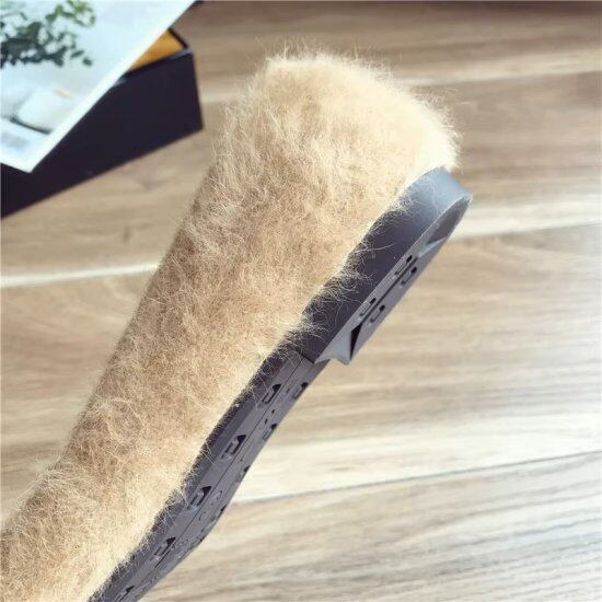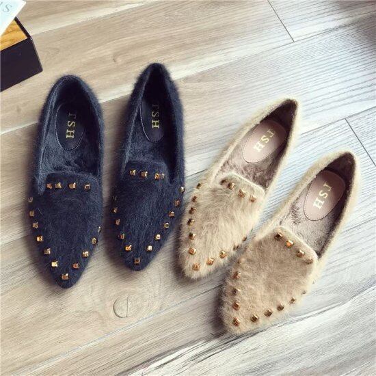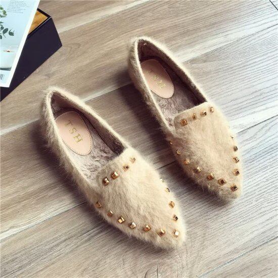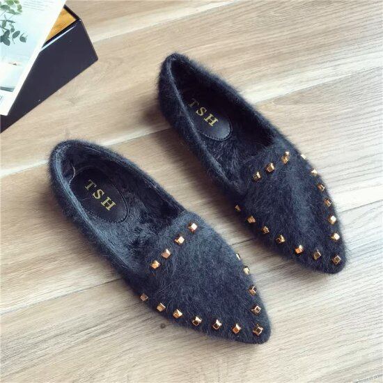 パンプス レディース ローファー ファー フラットシューズ ポインテッドトゥ フェイクファー エコファー スタッズ ビジュー ふわふわ ローヒール 1cmヒール レトロ 2color おしゃれ